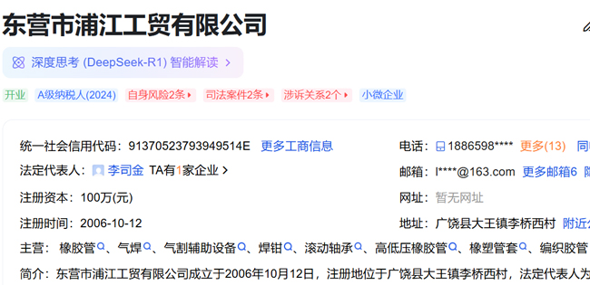 资料显示,东营浦江工贸成立于2006年,位于广饶县大王镇李桥西村。