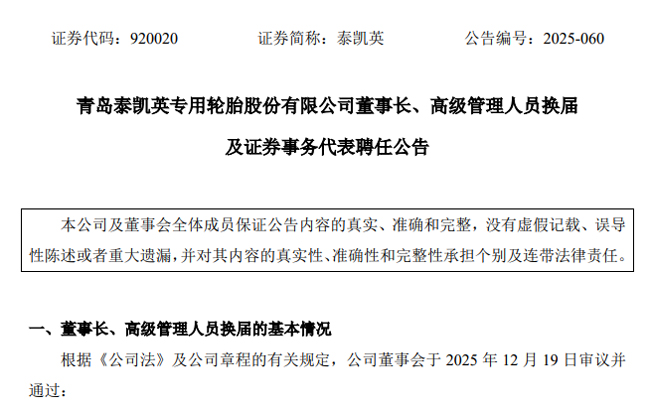 12月22日,青岛泰凯英专用轮胎股份有限公司,完成董事长及高级管理人员的换届。