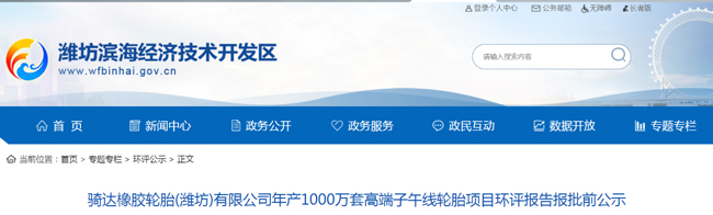 近日,山东潍坊滨海经济技术开发区,公示一份轮胎项目环评文件。