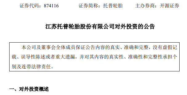 12月8日,江苏托普轮胎股份有限公司,发布对外投资公告。