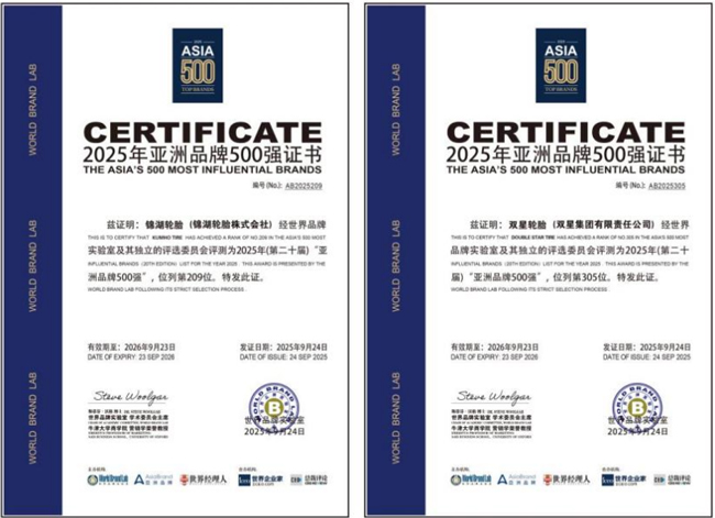 此次锦湖轮胎、双星轮胎蝉联“亚洲品牌500强”并持续提升,彰显了两个品牌在亚洲乃至全球市场的强劲竞争力。