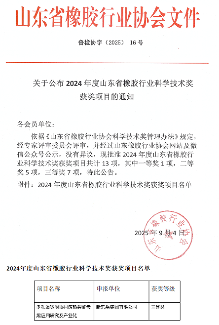 9月4日,山东省橡胶行业协会,公布了2024年度山东省橡胶行业科学技术奖获奖项目名单。