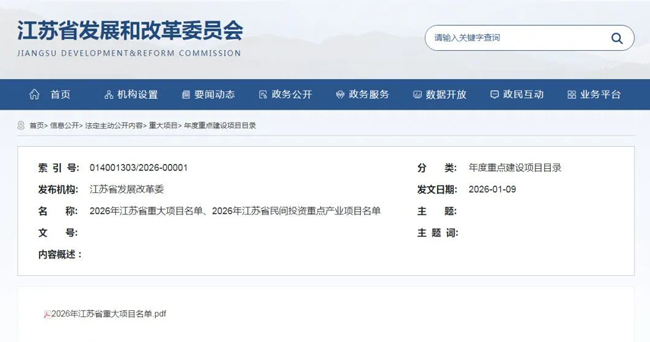 近日,江苏省发展改革委官网,发布2026年省重大项目名单。