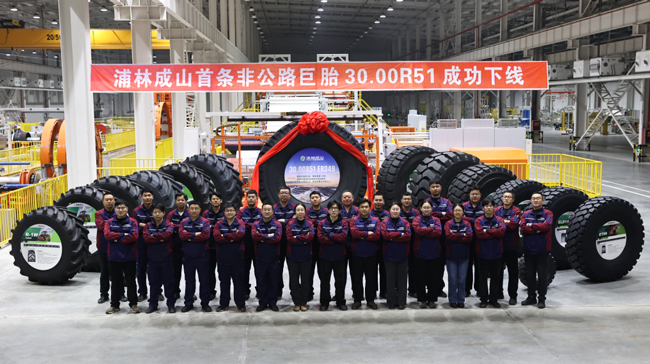 1月19日,浦林成山首条非公路巨胎30.00R51成功下线。