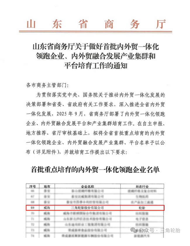 三角轮胎成功入选,成为该省首批重点培育的内外贸一体化领跑企业之一。