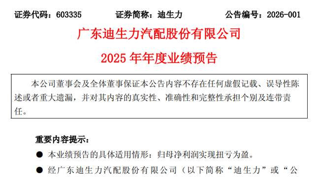 1月21日,广东迪生力汽配股份有限公司,发布2025年度业绩预告。
