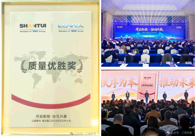 随后,在雷沃重工2026年供应商大会上,三角轮胎获颁“质量优胜奖”。