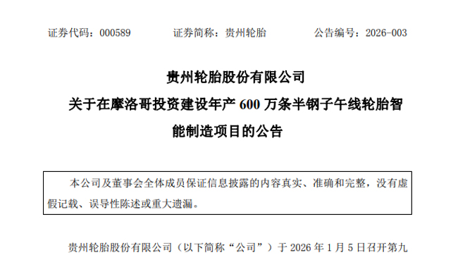 1月6日,贵州轮胎股份有限公司,发布对外投资公告。