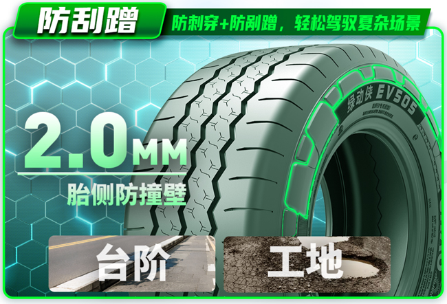 独特的冠部抗刺穿和胎侧防剐蹭设计,大大降低轮胎的故障率。