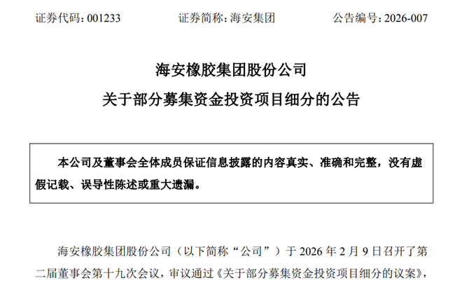 2月10日,海安橡胶集团股份公司,发布部分募集资金投资项目细分的公告。