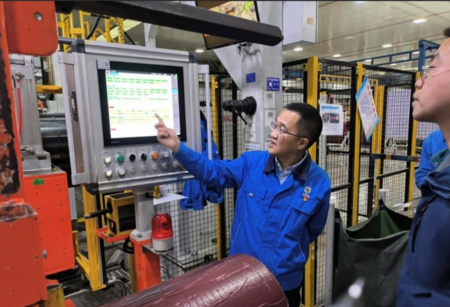 随后,他抽查成型机PLC安全首捡的执行情况,并亲自操作界面。