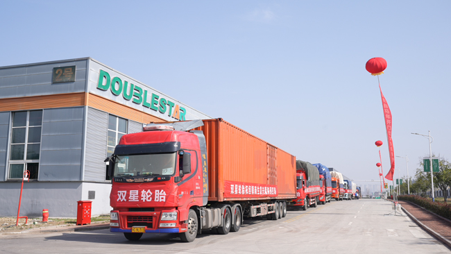 数十辆货车整齐列队,满载卡客车轮胎与乘用车轮胎,依次发车。