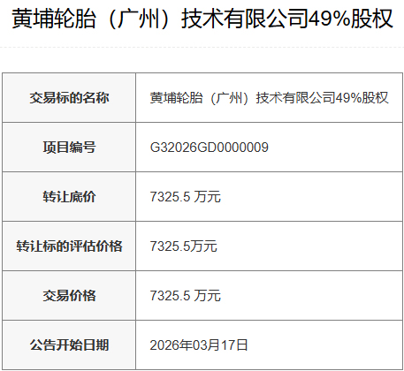 公告显示,标的为黄埔轮胎(广州)技术有限公司49%股权。
