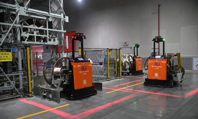 智慧工厂内,机械臂灵活抓取胎胚,AGV小车来回穿梭,一派繁忙景象。
