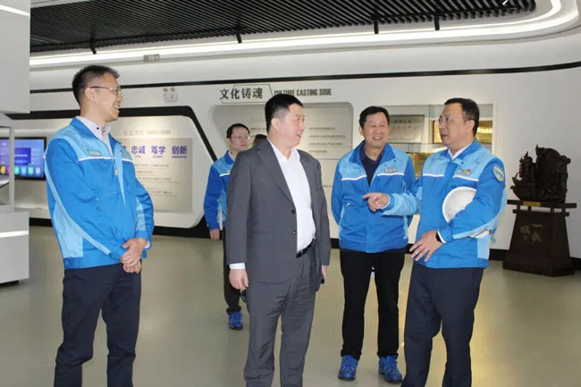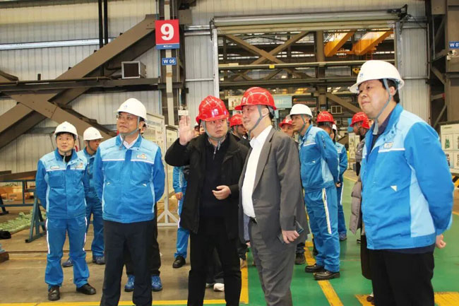 考察期间,中化橡机总经理、党委副书记刘孟辉,陪同范明深入生产车间。