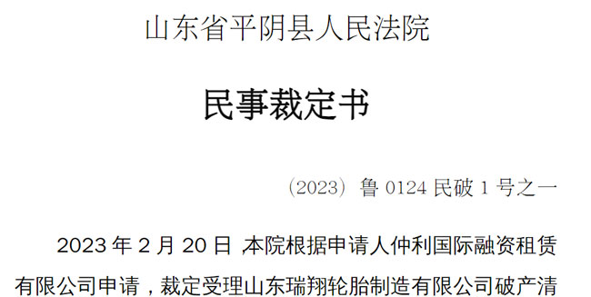 裁定书显示,山东瑞翔轮胎制造有限公司,正式宣告破产。
