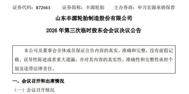 近日,山东丰源轮胎制造股份有限公司,召开2026年第三次临时股东会会议。