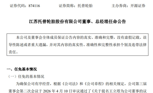 4月10日,江苏托普轮胎股份有限公司,发布董事、总经理任命公告。