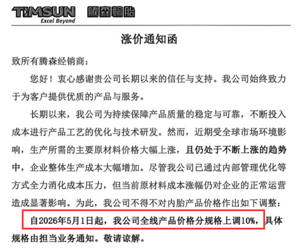 4月11日,腾森橡胶宣布,对旗下全线内胎产品价格上调10%。