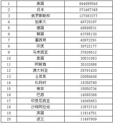 国内铝制车轮前6个月共出口到167个国家和地区。其中,出口排名前20位的国家名单及出口金额(美元)如下表:
