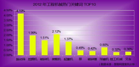 数据显示,振动筛以4.19%的占比成为11月最热门搜索词,挖掘机以1.99%的占比排在第二位,较上个月增长了0.23%,破碎机以1.51%的占比排在第三位。