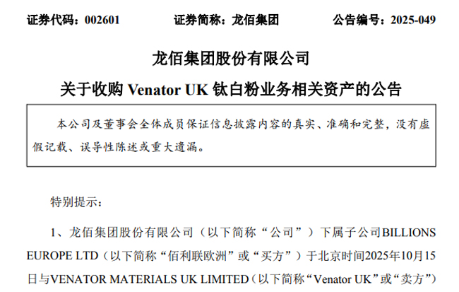 10月17日,龙佰集团股份有限公司,发布一份资产收购公告。