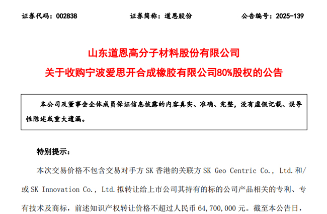 目前,道恩股份与 SK香港,已签署股权转让协议。