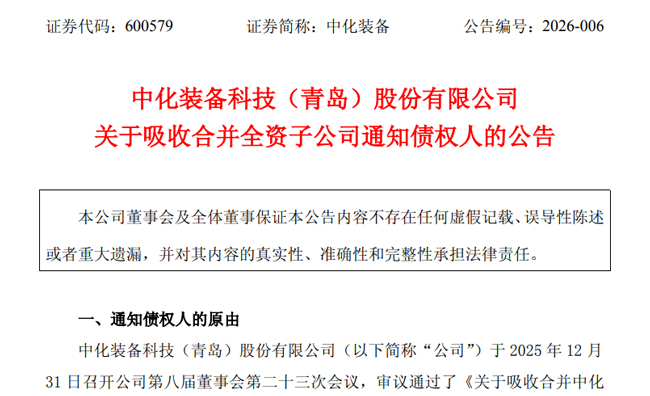 1月8日,中化装备科技(青岛)股份有限公司,发布一份公告。