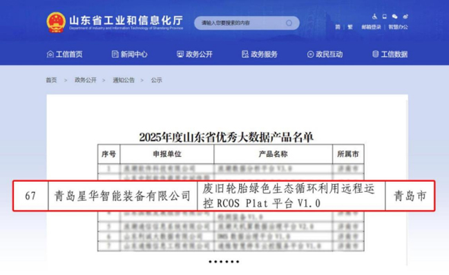 双星旗下青岛星华智能装备有限公司“废旧轮胎绿色生态循环利用远程运控RCOS Plat平台V1.0”,凭借领先的智能化设计与技术创新性,成功入选优秀大数据产品名单。