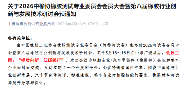 2026测试委会员大会暨第八届橡胶行业创新与发展技术研讨会,定于5月16~18日在山东广饶举办。