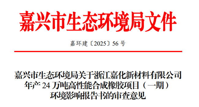 11月3日,浙江嘉化新材料有限公司年产24万吨高性能合成橡胶项目(一期)环评文件,获得批复。