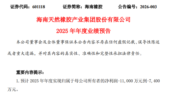 1月30日,海南天然橡胶产业集团股份有限公司,发布2025年年度业绩预告。