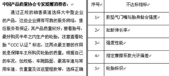 评估机构称,不合格的汽车轮胎产品,主要是胶垫气门嘴与胎身黏合强度、扯断伸长率、强度性能、指定摩擦系数允许偏差和轮胎标识等,不符合规定或不达标。