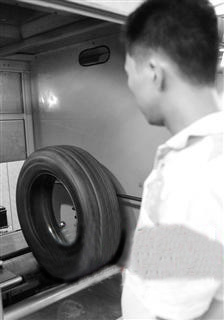 “看!轮胎上用力插入螺丝刀和钢钉,轮胎敲打起来却依然‘砰砰’作响,一点也不漏气。”升级中心的刘建华演示完扎轮胎后,将带有8根一寸多长铁钉的测试板放在汽车车轮下,车轮从测试板上碾过,只听得一阵“嚓嚓”声响,铁钉刺穿轮胎后又拔出,轮胎上留下8处钉痕,而轮胎并没有漏气,可以继续行驶。