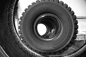 因巨型工程胎市场转好出现供不应求的局面,天津国际等多家企业近日陆续进行了巨型工程子午胎项目投资。图为桂林轮胎质检人员正在对刚下线的40.00R-57全钢巨胎进行检查。