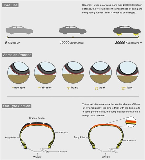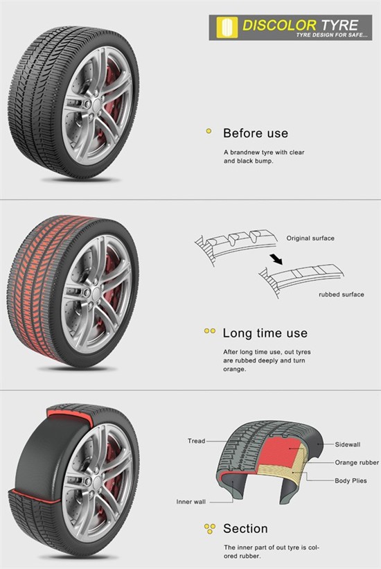 这种轮胎的原理并不难理解,两位设计师在轮胎的橡胶胎面里加入薄薄的橙色橡胶层,当胎面磨损到需要更换时,橙色橡胶层就会露出来,这种鲜艳的警示色能提醒车主:“你该换轮胎了。”