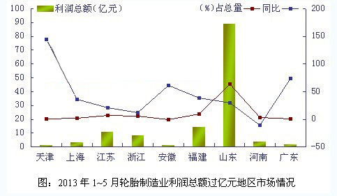 据相关部门统计,2013年1-5月,我国轮胎行业累计利润额为138.28亿元,较去年同期增长29.5%。从各地区市场的利润总额来看,1-5月,山东省实现累计利润89.12亿元,同比增长29.2%,占轮胎制造业利润总额的64.45%;紧随其后的是福建省与江苏省。