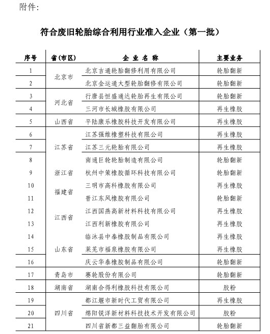 按照《工业和信息化部关于印发<废旧轮胎综合利用行业准入公告管理暂行办法>的通知》(工信部节〔2013〕86号)要求,现对符合准入条件要求的21家企业名单(第一批)予以公示,公开向社会和工业企业征求意见。