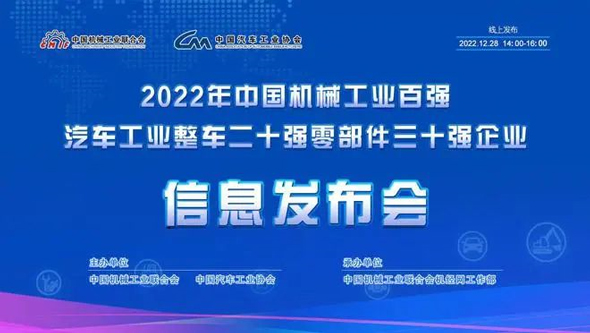 12月28日, 2022年中国机械工业百强和汽车工业整车二十强、零部件三十强 企业信息线上发布会,在北京召开。