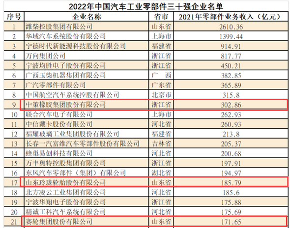 轮胎世界网获悉,中策、玲珑、赛轮国内三大轮胎巨头,进入零部件三十强 榜单。