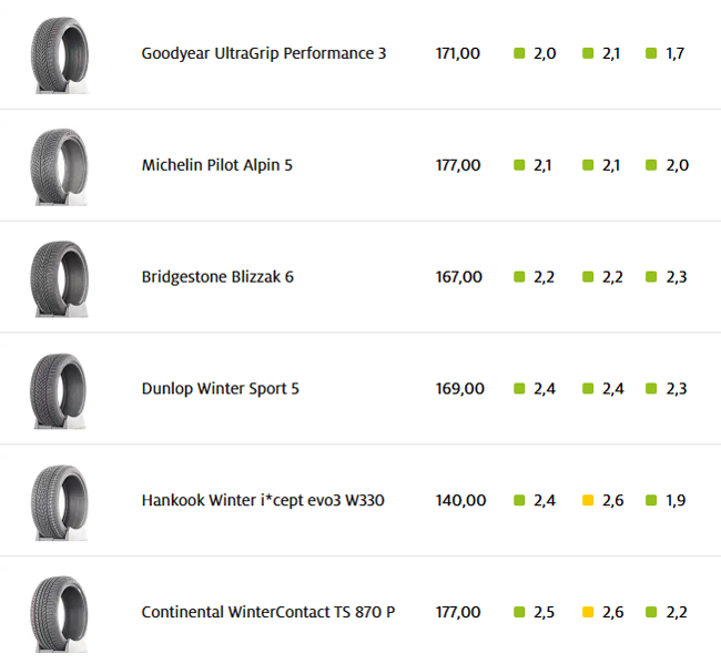 测试结果显示,共有6款轮胎,被列入“强烈推荐”名单。