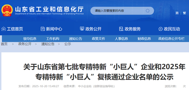 10月20日,山东省第七批专精特新“小巨人”企业名单,对外公示。