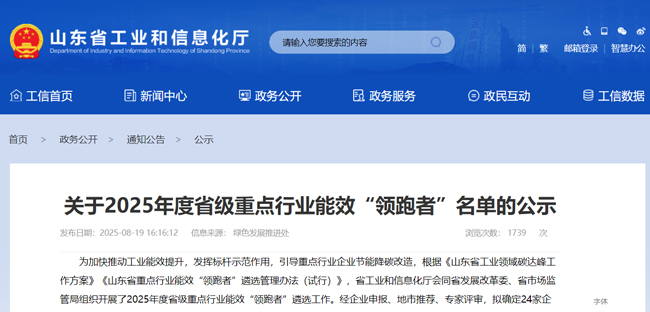 8月19日,2025年度山东省级重点行业能效“领跑者”名单,对外公示。