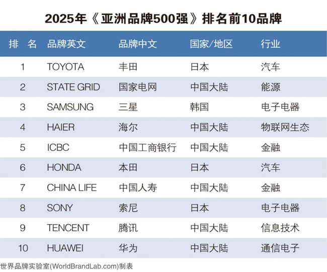 2025年的榜单前3名,分别为丰田、国家电网和三星。