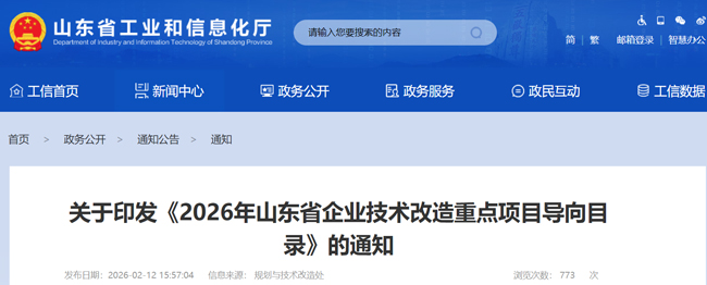 2月12日,山东省工业和信息化厅,公布《2026年山东省企业技术改造重点项目导向目录》。
